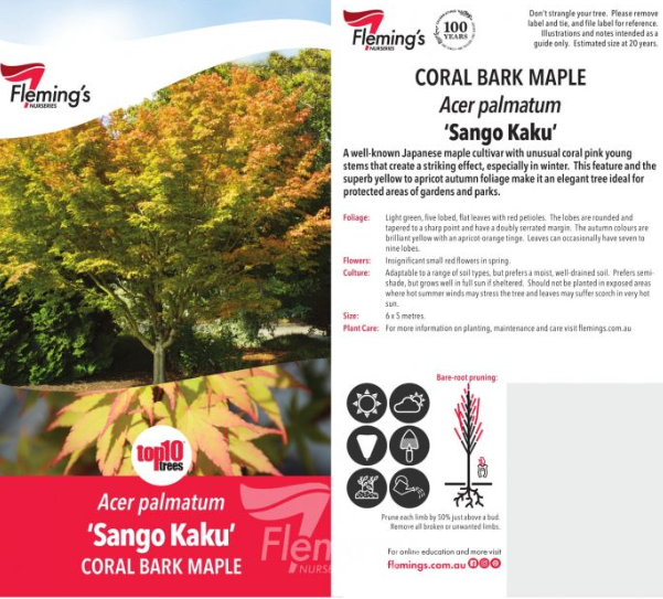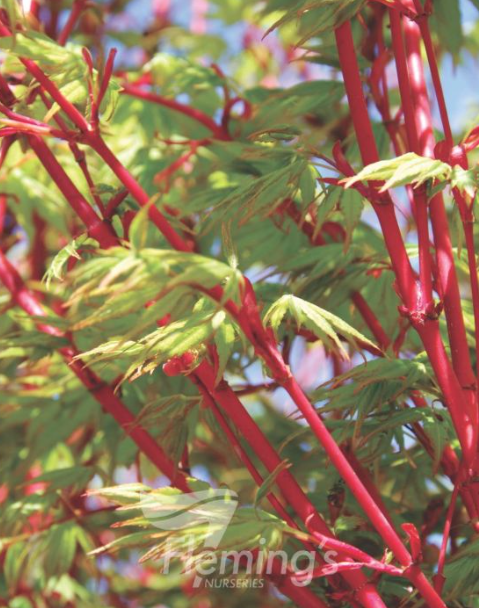 A well-known Japanese maple cultivar with unusual coral pink young stems that create a striking effect, especially in winter. This feature and the superb yellow to apricot autumn foliage make it an elegant tree ideal for protected areas of gardens and parks.