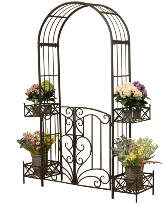 Garden Arch – w Gate and Planters in Rustic Brown