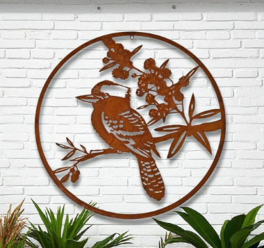 Laser cut metal wall art with kookaburra in wattle blossom design in rust finish