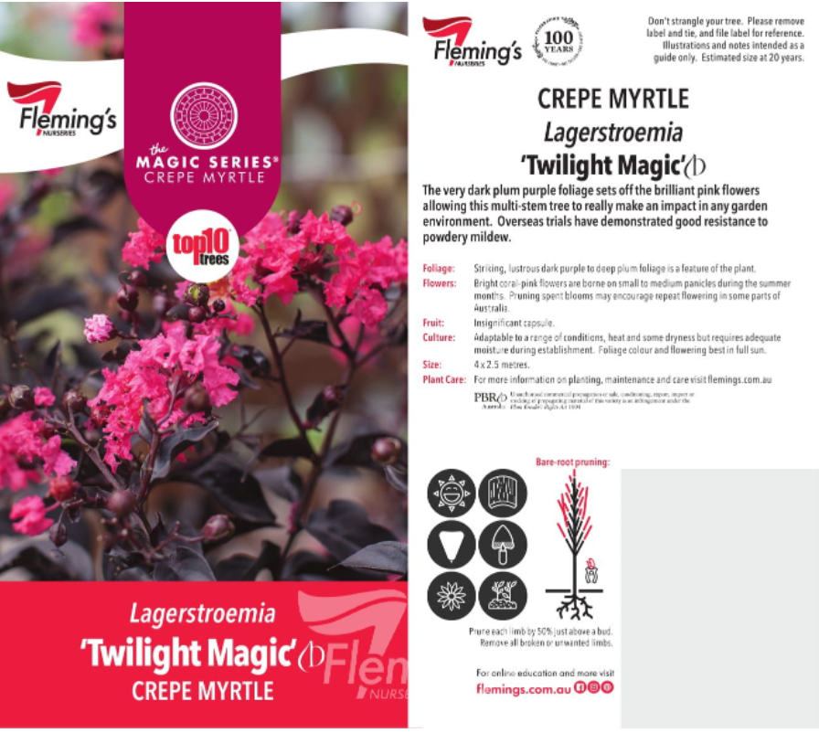 Bright coral-pink flowers are borne on small to medium panicles during the summer months. Pruning spent blooms may encourage repeat flowering in some parts of Australia.