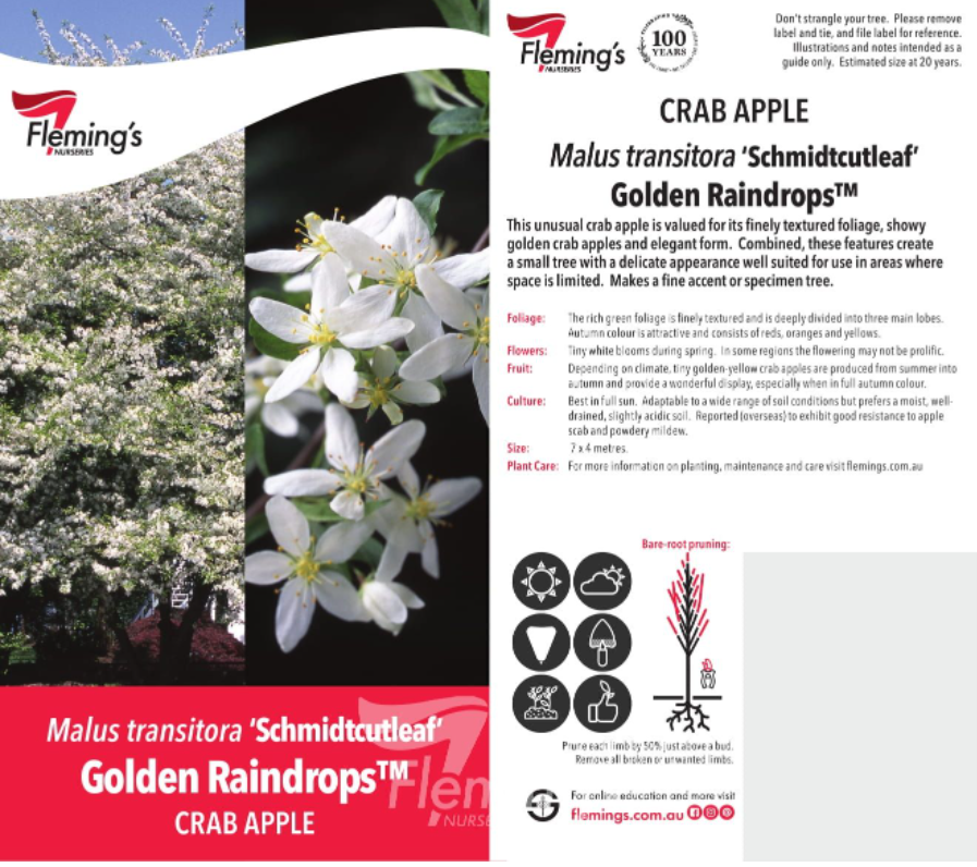 Tiny golden crab apples are produced from summer into autumn and provide a wonderful display, especially when in full autumn colour.