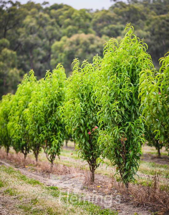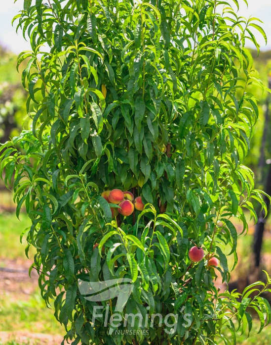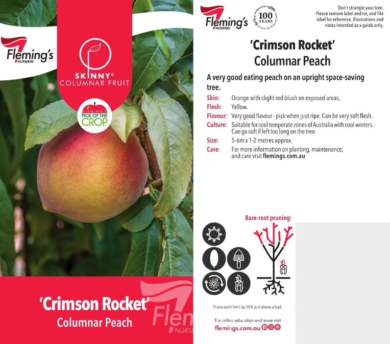 ‘Crimson Rocket’ is the first columnar peach to be released in Australia. This delectable freestone peach pulls cleanly and easily from the stone when ripe, and with sweet delicate flavour with little tartness and medium juiciness this is a great peach.