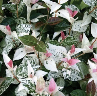 APPEARANCE : Variegated evergreen self-twining low ground cover or climber. Perfumed white star like flowers in spring and summer. Glossy green leaves are patterned with splashes of white, copper-tan and pink, which varies from plant to plant.
